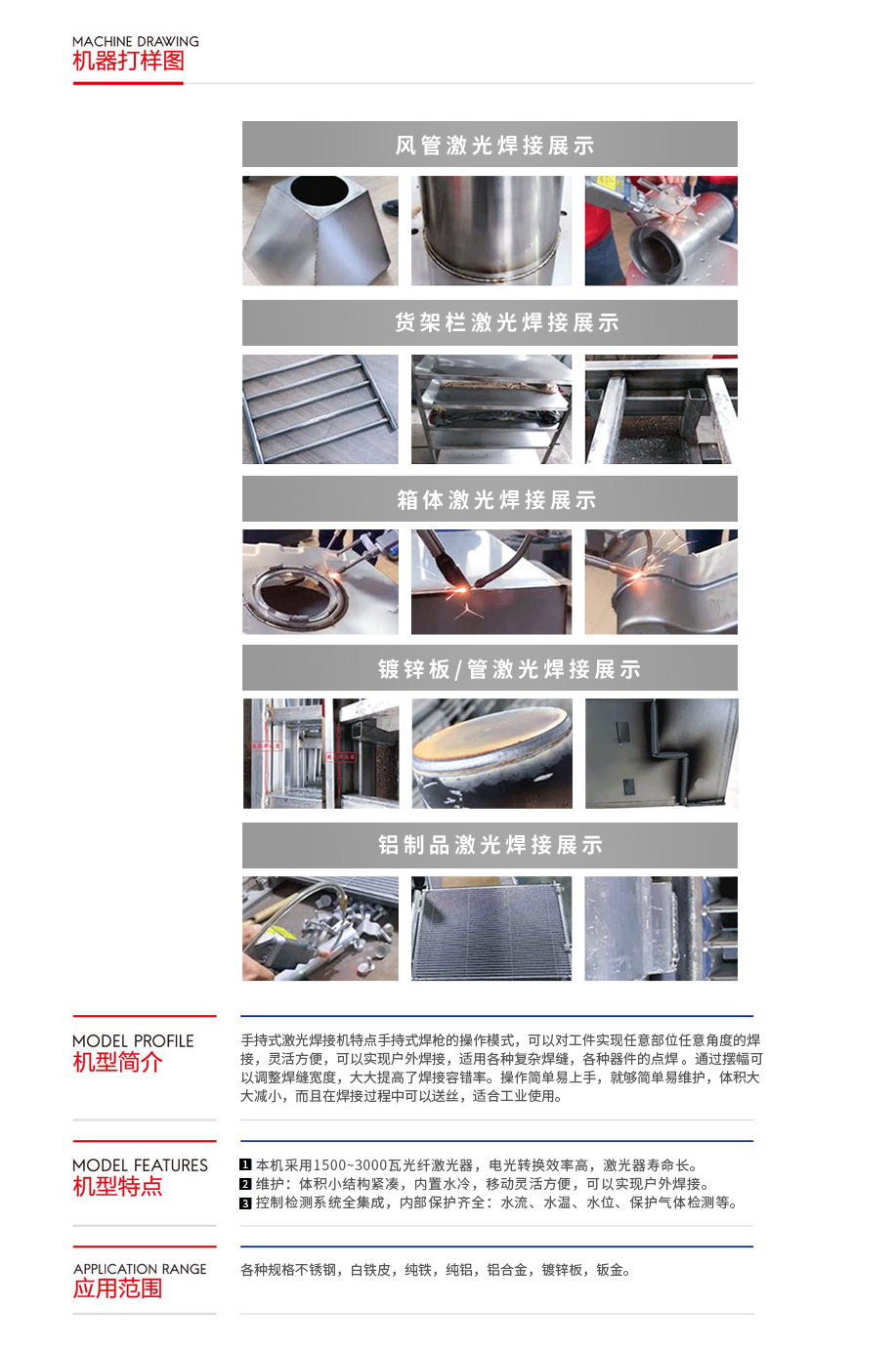 应用于电子、通讯、五金等行业大批量生产企业的焊接,包括各种规格不锈钢,白铁皮,纯铁,纯铝,铝合金,镀锌板,钣金。